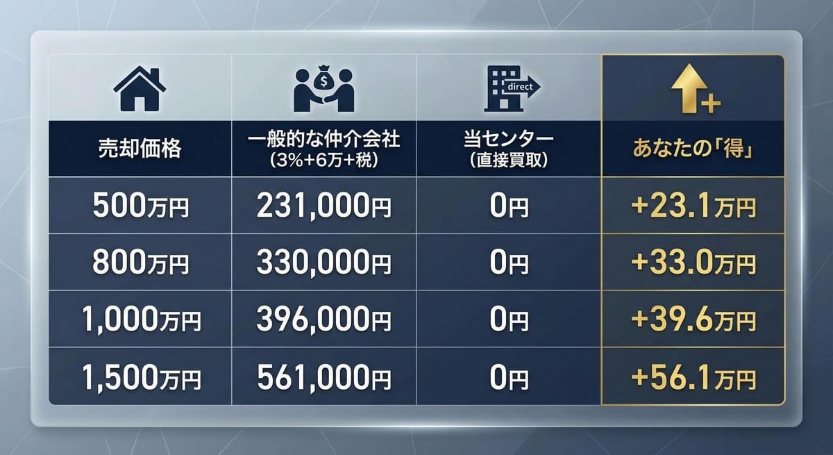 「仲介手数料」という名の大きな損失を、あなたは払い続けますか? 当センターなら、同じ売却価格でも最大数十万円が多く手元に残ります。